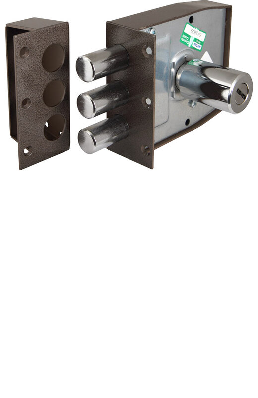 Боковой накладной замок (3 ригеля) с нажимным цилиндром диаметром 34мм., с одной точкой запирания.Открытие изнутри ручкой. Удаление ключевого отверстия 63мм. Ход засовов 36мм.