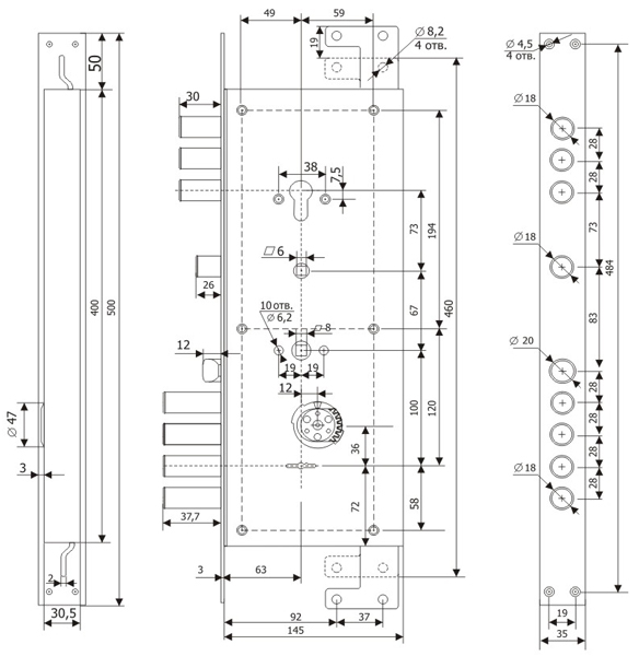 Замок Guardian (Гардиан) врезной двухсистемный ЗВ 25.14 Т (прав) с тягами (без накл), 5+1 кл (длин. кл. 54мм) /123:454/
