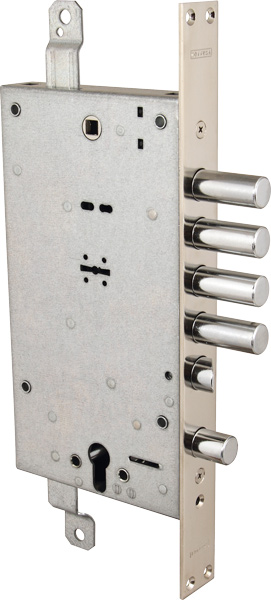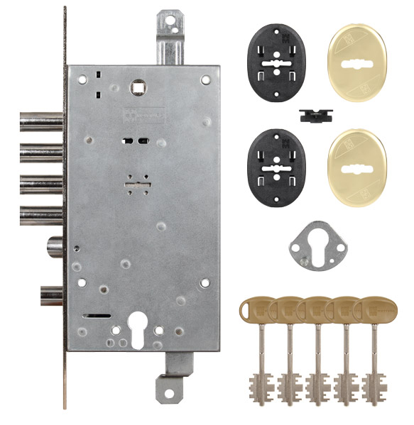 Замок врезной двухсистемный Mottura 54.797 S левосторонний предназначен для металлических и бронированных дверей. Основной сувальдный замок + вспомогательный цилиндровый замок с блокировкой верхнего ключевого отверстия. Реверсивная защелка. Верхний сувальдный 4 оборотный замок с тремя точками запирания с защелкой диаметром 20 мм, приводимой в действие ключом, фалевой ручкой и цилиндровым механизмом. Круглые ригели диаметром 18 мм с ходом 40 мм для сувальдного замка. Нижний замок 2 оборотный под европейский цилиндр с круглым ригелем диаметром 18 мм с ходом 22 мм, запирающий ключевое отверстие верхнего замка. Бэксет: 63 мм. Ход тяг 20 мм. В комплекте 5 сувальдных ключей 40 мм, 1 внутренняя накладка, 1 внешняя накладка.