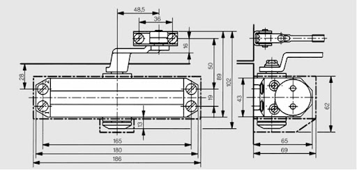 Доводчик TS 77 подходит для дверей весом до 120 кг, ширина двери до 1100 мм. Максимальный угол открывания – 180°
