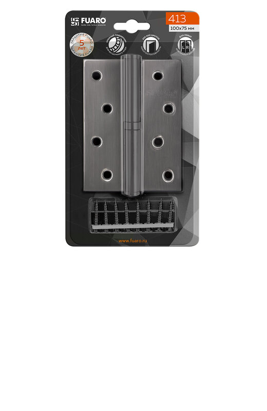 Съемная дверная петля Fuaro 413/BL-4 правая изготовлена из стали, подходит для дверей правого открывания. Гальваническое покрытие прошло тест на устойчивость к коррозии в соляном тумане - более 96 часов, что соответствует высшему 4 классу стойкости покрытия. Края петель прошли дополнительную полировку. В петле 413/BL-4 установлены подшипник и стальной стержень, что обеспечивает 1 млн циклов открывания/закрывания. Максимальная нагрузка на 2 петли 30 кг, на 3 петли 45 кг. Размер петли: 100x75x2,5. Цвет: хром. Саморезы в комплекте. Гарантия: 5 лет. Упаковка: блистер.