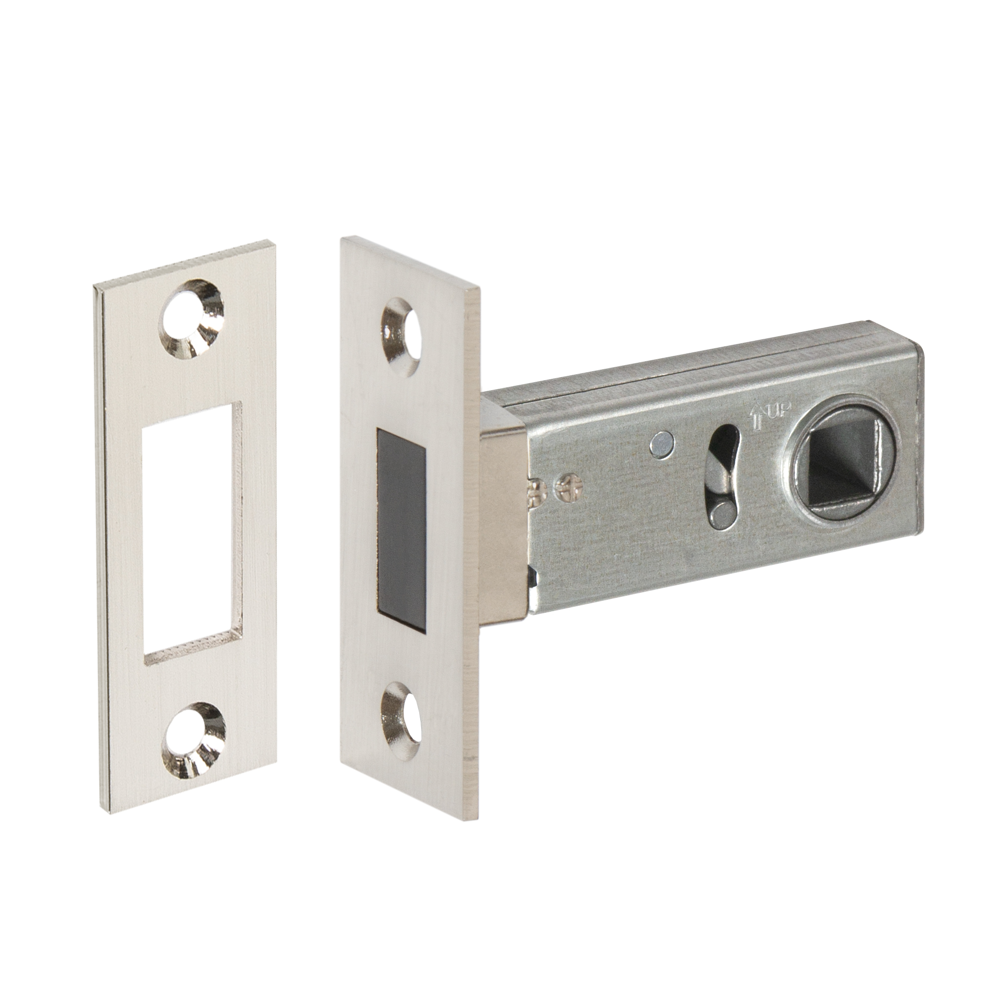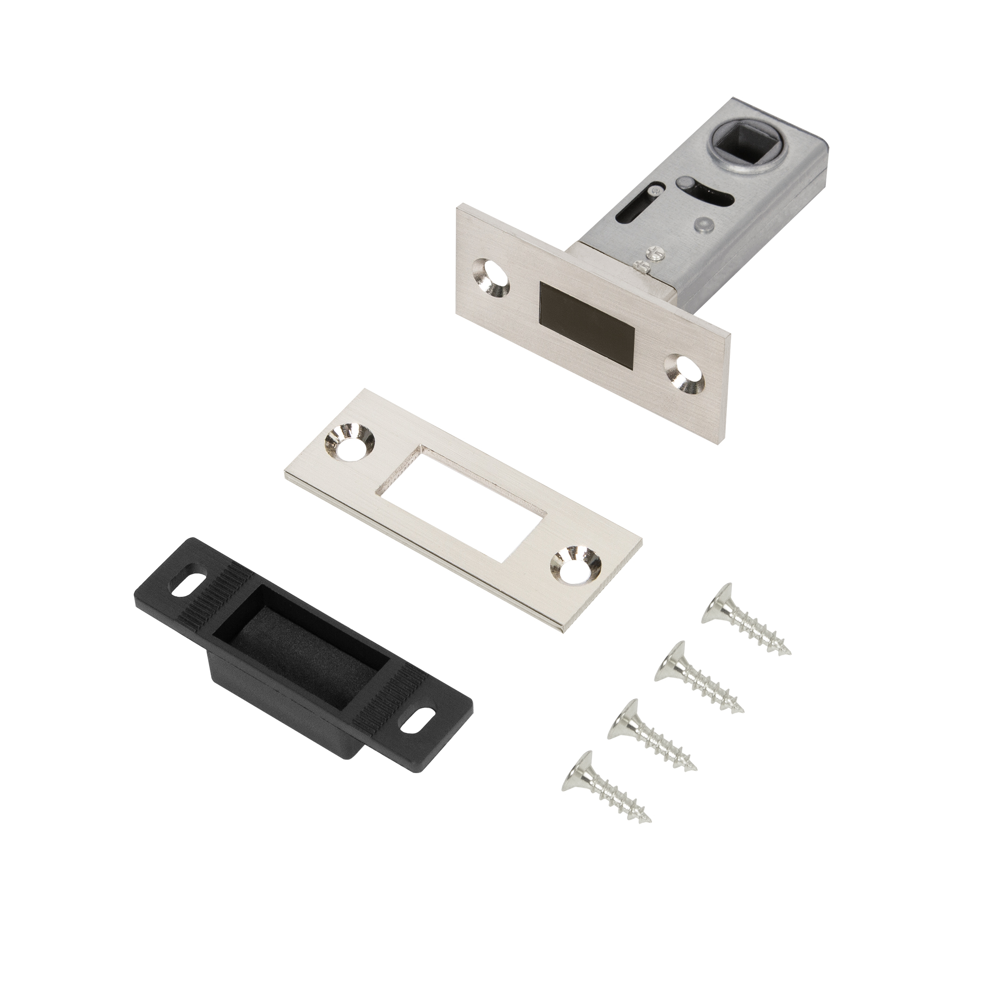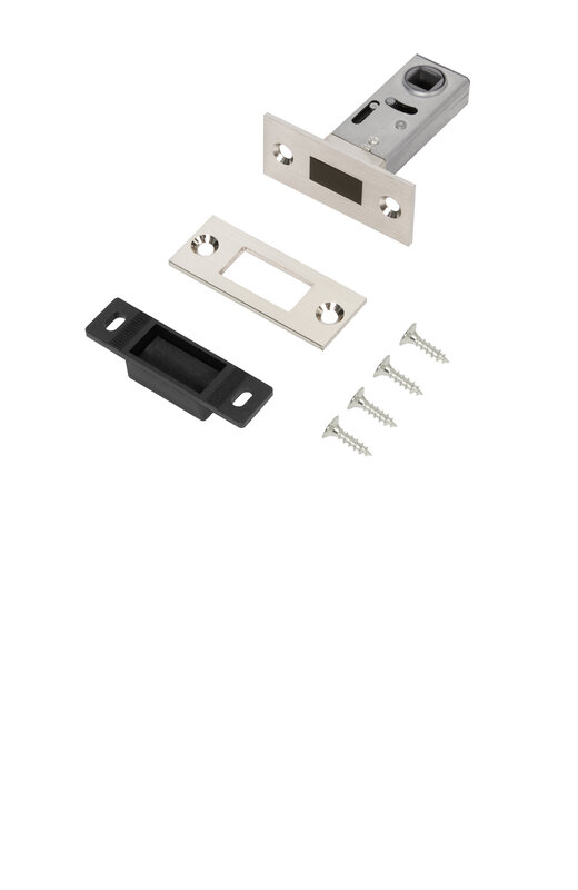 Отверстия под стяжные винты находятся на расстоянии 38 мм. Размер бэксета - 50 мм. Регулируемая ответная планка с магнитной вставкой ±1,5 мм. Возможна установка дверных ручек на стяжные винты для более прочного крепления. Цвет: матовый никель. В комплектацию входят: ответная планка с магнитной вставкой и крепежная фурнитура в цвет изделия.