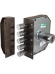 Боковой накладной замок (5 ригелей), с одной точкой запирания. Удаление ключевого отверстия 63мм. Открытие изнутри ручкой. Одинарный наружный нажимной цилиндр. Размеры корпуса 132х146х30. Ход засовов 40мм.