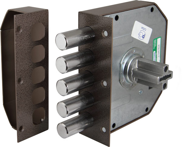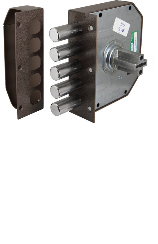 Боковой накладной замок (5 ригелей), с одной точкой запирания. Удаление ключевого отверстия 63мм. Размеры корпуса 132х146х30. Ход засовов 40мм.