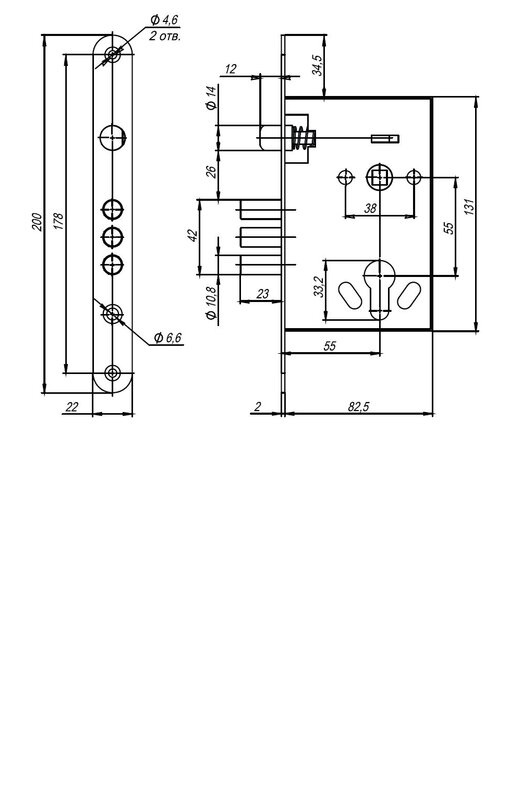 Комплектация : корпус замка, ручки на планке, квадрат под ручки (8х100мм), стяжные винты, винт для цилиндра, паспорт изделия.