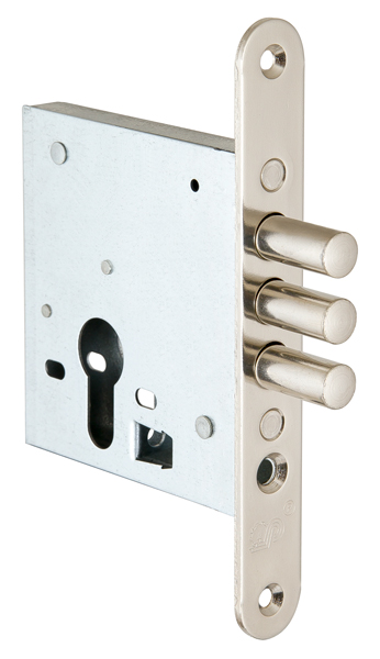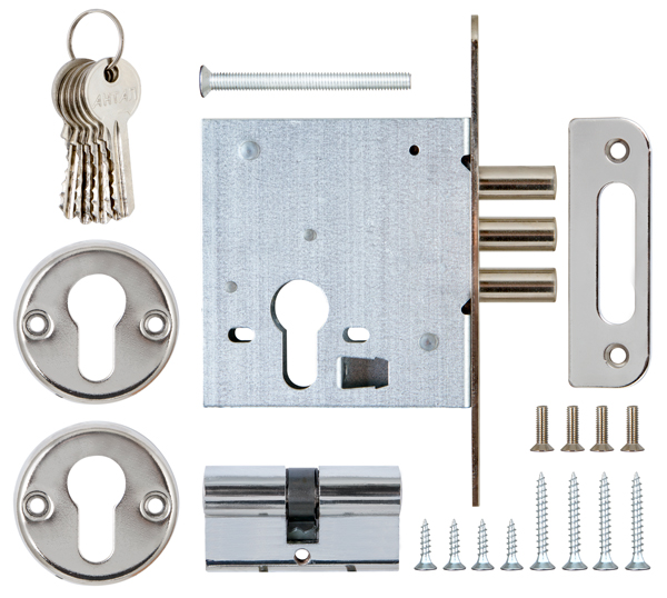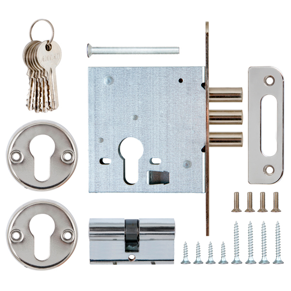 Замок врезной цилиндровый ЗВ1-2/11 предназначен для входных и внутренних дверей толщиной 40-50 мм жилых домов, квартир, торговых помещений. Универсальный, возможна установка как в правые, так и в левые двери. В комплекте: комплект круглых накладок (покрытие «никель»), цилиндровый механизм, 6 стальных ключей длиной 56 мм, ответная планка. Закрывается и открывается только с помощью ключа. Засов из трех стальных стержней круглого сечения. Покрытие корпуса — цинковое. Покрытие лицевой и ответной планок — никелевое. Вылет ригелей — 22 мм, диаметр ригеля — 10,7 мм. Бэксет - 52,2 мм.