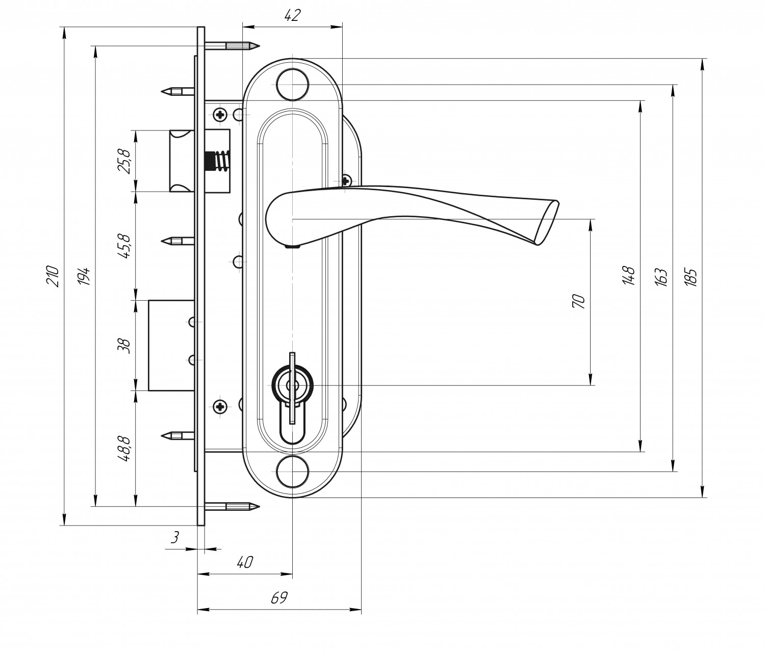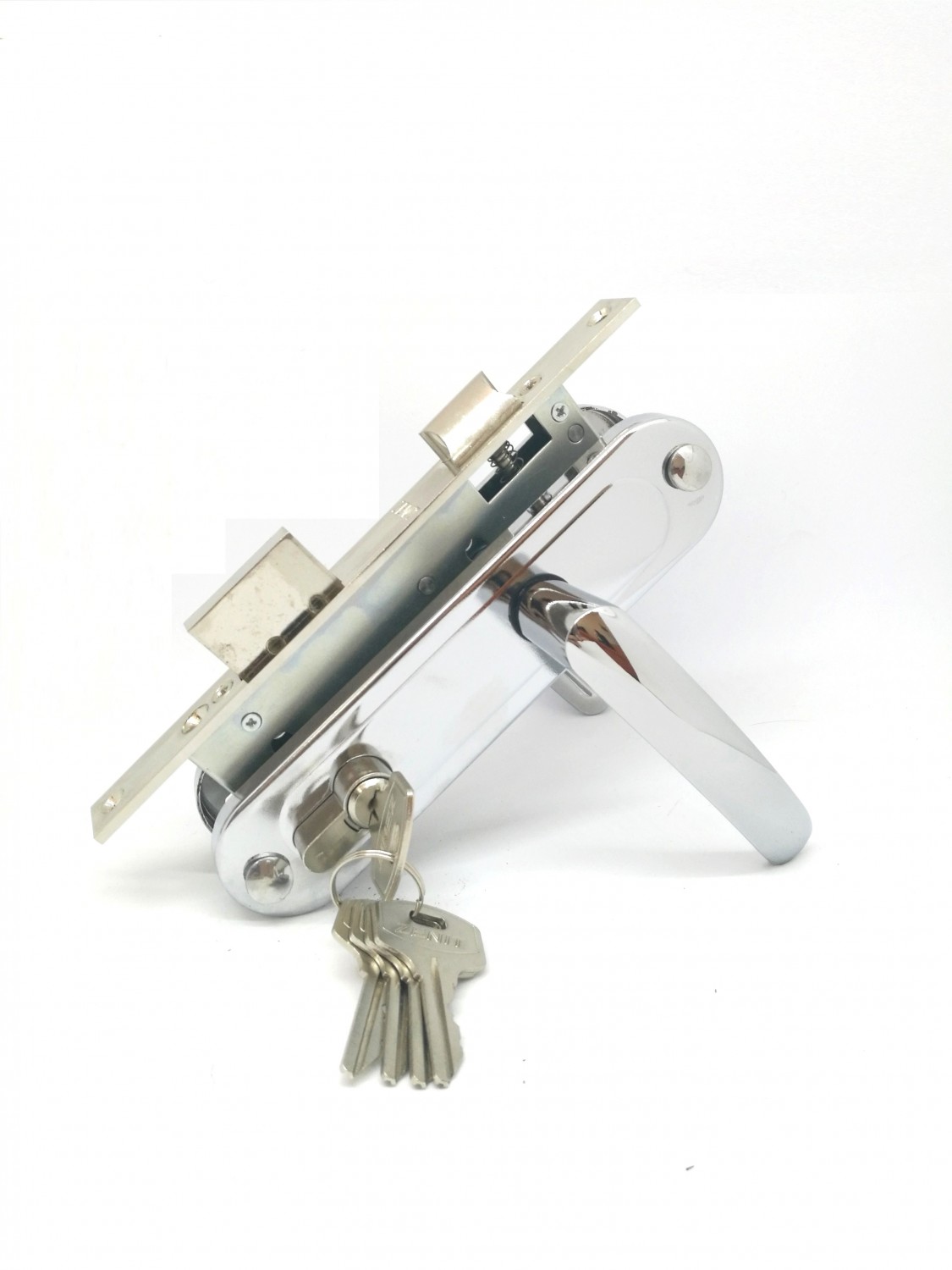 Замок врезной цилиндровый с защёлкой ЗВ7-70.4-02 в комплекте с ручкой предназначен для установки в легкие двери. Корпус замка выполнен из стали, ручки из алюминия. Цвет ручек: хром. Цилиндр обеспечивает 15 000 секретных комбинаций. Комплектуется 5-ью английскими ключами. Межосевое расстояние 70 мм.