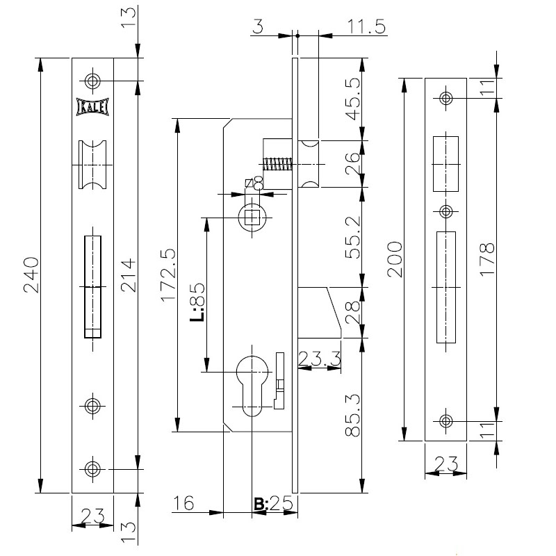 Корпус Kale kilit (Кале килит) узкопрофильного замка с защёлкой 253 (25 mm) w/b (никель)