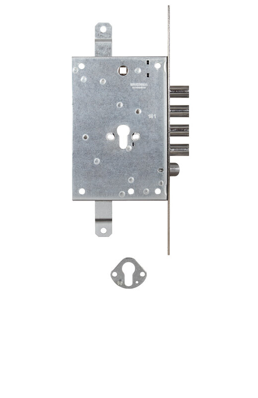 Корпус врезного замка 85.971 D с тремя точками запирания для цилиндрового механизма с защелкой предназначен для правосторонних дверей. Реверсивная защелка диаметром 20 мм приводится действием цилиндром и фалевой ручкой. Бэксет 63 мм. Ход 4 круглых ригелей диаметром 18 мм - 30 мм. Межосевое расстояние ригелей 28 мм. Ход тяг 20 мм.