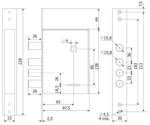 Встроенная задвижка в корпусе замка. Защита от наиболее распространенных методов вскрытия; защита от вскрытия отмычкой – ложные пазы на стойке и сувальдах, увеличенная жесткость пружин сувальд; защита от «свертыша» – ослабленный зуб рейки хвостовика; защита от взлома – при полностью выдвинутых ригелях замка, 30% их длины остается в корпусе замка, усилена конструкция засовов; защита от высверливания – закаленная стойка рейки хвостовика; защита от вандалов – отсутствует нижняя стенка корпуса замка. Фиксация засова задвижки в крайних положениях. В комплекте 4 длинных ключа. Гарантия 5 лет.