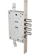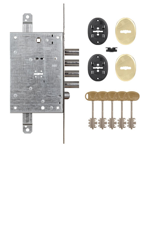 Замок врезной , с тремя точками запирания и защёлкой диаметром 20мм, приводимой в действие ключом и фалевой ручкой сечением квадрата 8мм. Удаление ключевого отверстия и ручки 60мм. Круглые ригеля диаметром 18мм. Ход тяг 19мм.