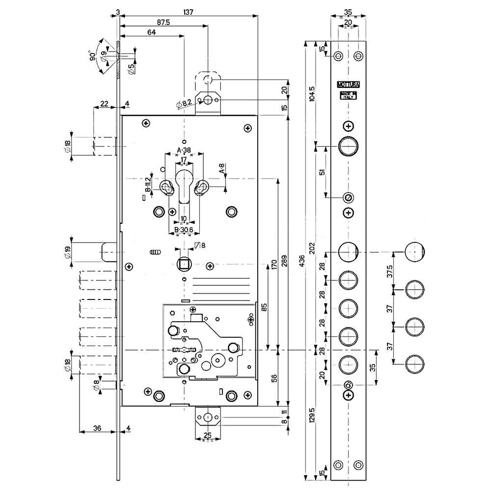 Замок врезной двухсистемный перекодируемый Mottura 54.J939M My Key D предназначен для металлических и бронированных дверей правого открывания. Это более усовершенствованная модель: нуклео больше не выступает над поверхностью и не требует под себя «окно» в двери. Инновационные замки My Key имеют подвижные сферы на стержне ключа и внутренние пины, существенно затрудняющие вскрытие отмычками (патент компании Mottura). При повороте ключа ключевое отверстие перекрывается вращающейся пластиной, которая препятствует использованию отмычек. При закрывании цилиндрового замка пластина из особо прочной марганцовистой стали полностью перекрывает ключевое отверстие сувальдного замка. Пластина из марганцовистой стали защищает замок от высверливания и вскрытия отмычками. Удобная перекодировка с торца замка. С каждым замком поставляется инструкция по перекодировке на русском языке. Возможность изменять кодовую комбинацию замка неограниченное количество раз. Функция перекодировки замка позволит самостоятельно и в любой момент заменить ключи в замке. Возможно самостоятельно создавать мастер-системы. Нижний 4-оборотный замок на три точки запирания с реверсивной защелкой диаметром 19 мм, приводимой в действие ключом и ручкой. Верхний 2-оборотный боковой цилиндровый замок с шестереночным приводом приводит в действие защелку и ограничитель открывания. Ограничитель открывания независимый. В комплекте: 5 сувальдных ключей 40 мм в герметичной упаковке, 1 внутренняя накладка, 1 наружная накладка.