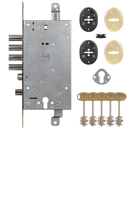 Замок врезной двухсистемный Mottura 54.797 D правосторонний предназначен для металлических и бронированных дверей. Основной сувальдный замок + вспомогательный цилиндровый замок с блокировкой верхнего ключевого отверстия. Реверсивная защелка. Верхний сувальдный 4 оборотный замок с тремя точками запирания с защелкой диаметром 20 мм, приводимой в действие ключом, фалевой ручкой и цилиндровым механизмом. Круглые ригели диаметром 18 мм с ходом 40 мм для сувальдного замка. Нижний замок 2 оборотный под европейский цилиндр с круглым ригелем диаметром 18 мм с ходом 22 мм, запирающий ключевое отверстие верхнего замка. Бэксет: 63 мм. Ход тяг 20 мм. В комплекте 5 сувальдных ключей 40 мм, 1 внутренняя накладка, 1 внешняя накладка.